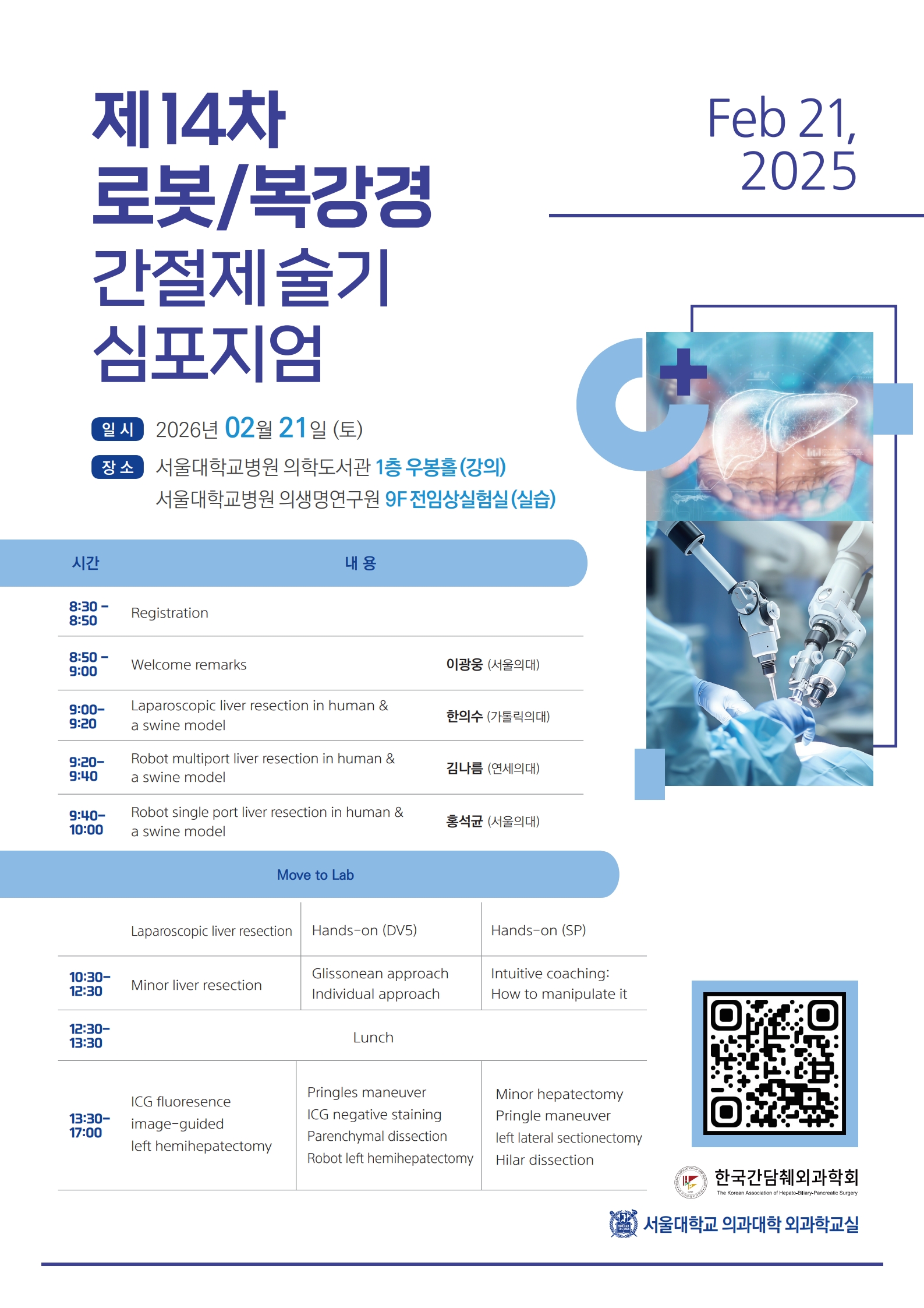 제14차 로봇/복강경 간절제술기 심포지엄 2026년 2월 21일(토), 서울대학교병원 의학도서관 1층 우봉홀